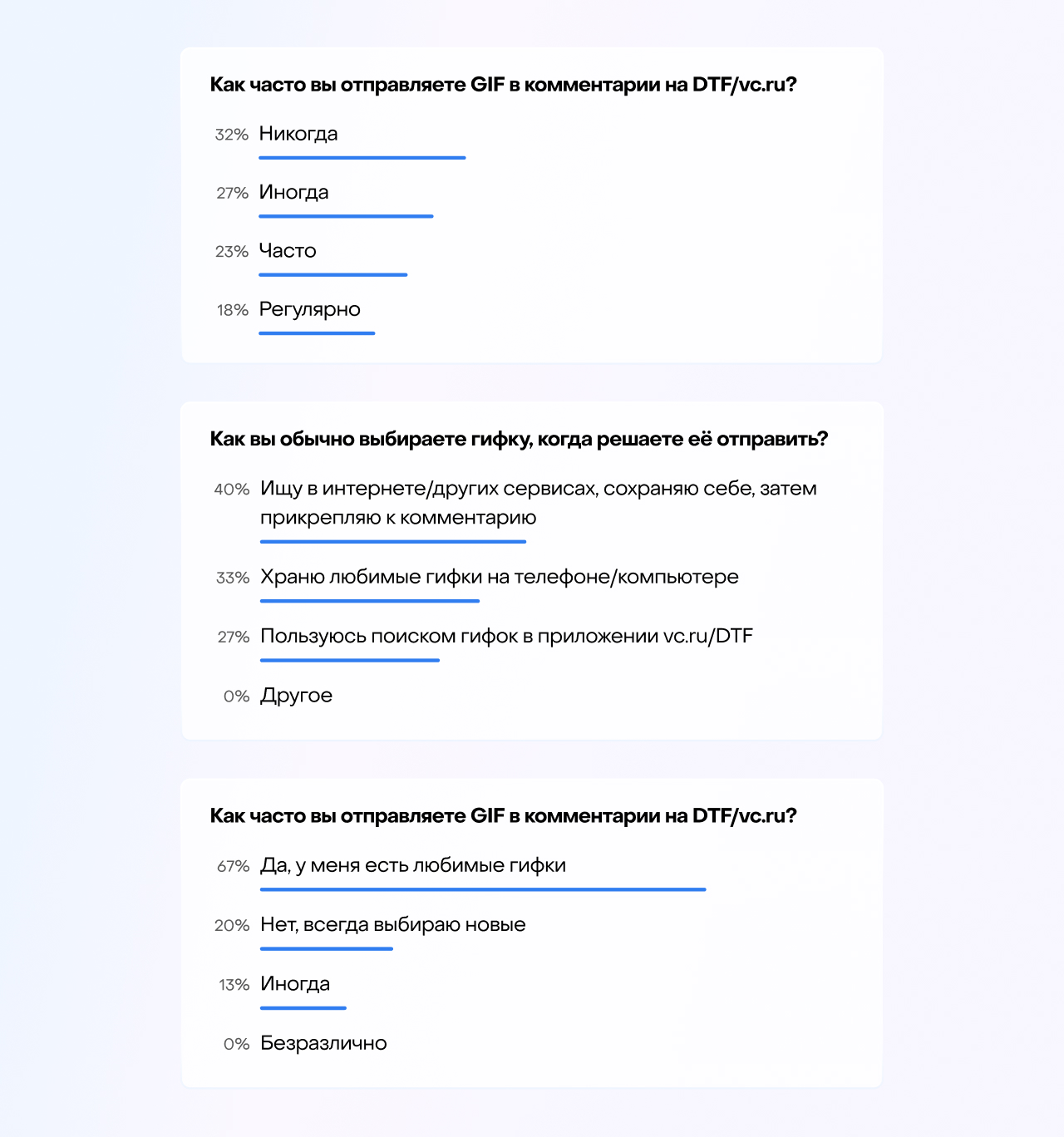 Пользователи ежедневно публикуют десятки тысяч комментариев — это важная часть бизнес-модели DTF и его внутренней культуры. Чтобы комментарий получил большое количество реакций или вызвал оживленную дискуссию, он должен быть удачным или привлекательным: как вариант — за счёт удачно подобранной GIF.